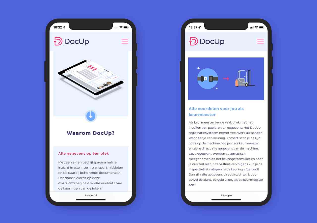 Een mooi voorbeeld van een applicatie die wij hebben ontwikkeld is DocUp. Binnen deze applicatie maken we de hele intern transportmiddelenvloot inzichtelijk. Daarnaast kunnen gebruikershandleidingen van machines digitaal bekeken worden én is er een mogelijkheid om met een QR-code dagelijke controles uit te voeren. Op elk moment van de dag zijn alle gegevens van de betreffende machines in te zien. De tool is gebruiksvriendelijk en begrijpelijk voor iedereen die er gebruik van maakt. Van chauffeurs en keurmeesters tot logistiek managers.