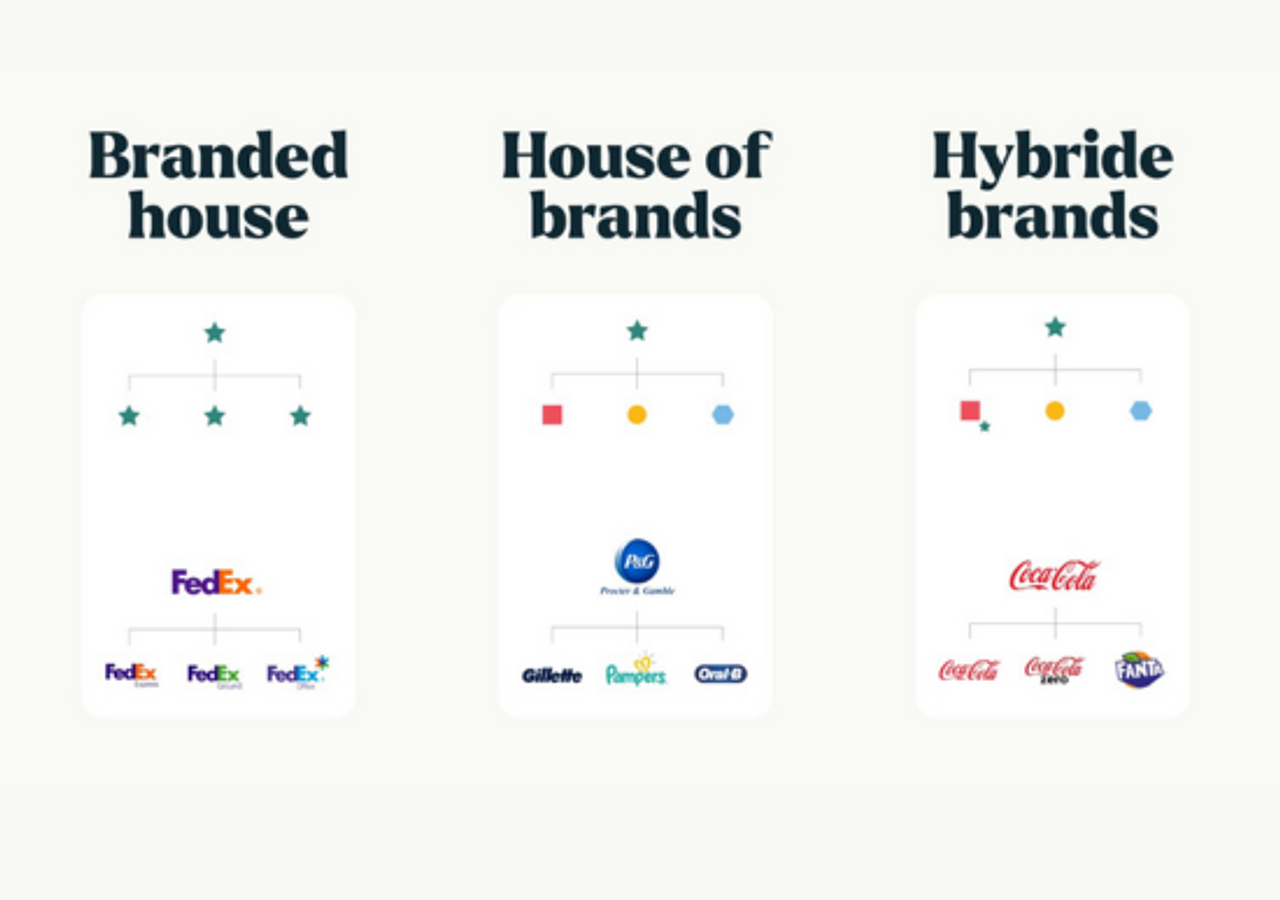 - House of Brands: ieder merk staat op zichzelf. Zoals Unilever of P&G. Hiermee kun je inspelen op verschillende doelgroepen en markten zonder dat ze elkaar beïnvloeden.