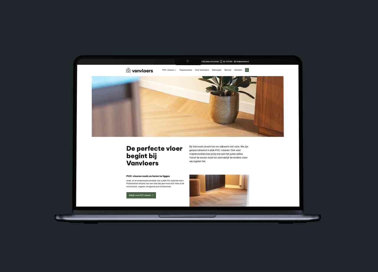 Met een nieuwe naam, een sterk visueel concept en consistente communicatie staat vanvloers stevig op de markt. De identiteit ademt vakmanschap en vertrouwen. De uitstraling klopt op elk niveau. Hier staat een stevig fundament voor groei. Hier staat vanvloers.