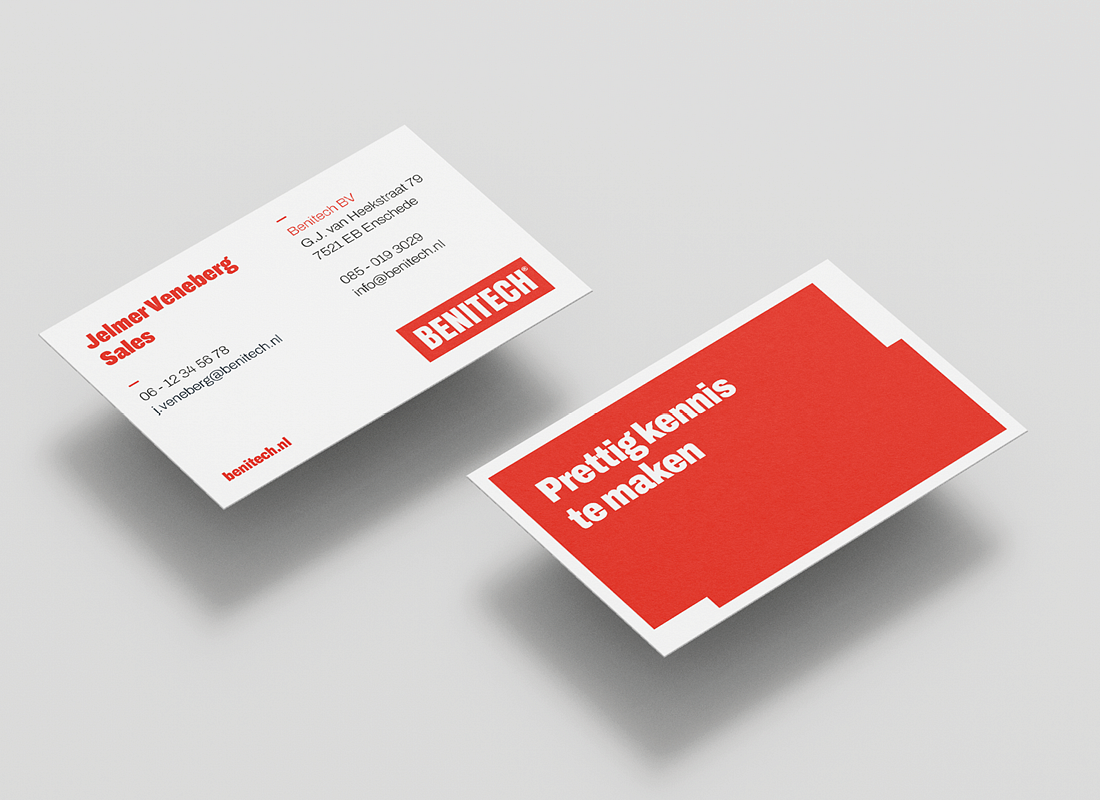 Benitech levert hoge kwaliteit producten. Een sterke, maar vooral professionele huisstijl is daarom ontzettend belangrijk. Wij hebben de stijl van Benitech onder de loep genomen, maar één ding is onveranderd gebleven: het logo. De basis staat. Nu is het tijd voor de verdere uitrol. Van visitekaartjes en flyers tot een maatwerk website.