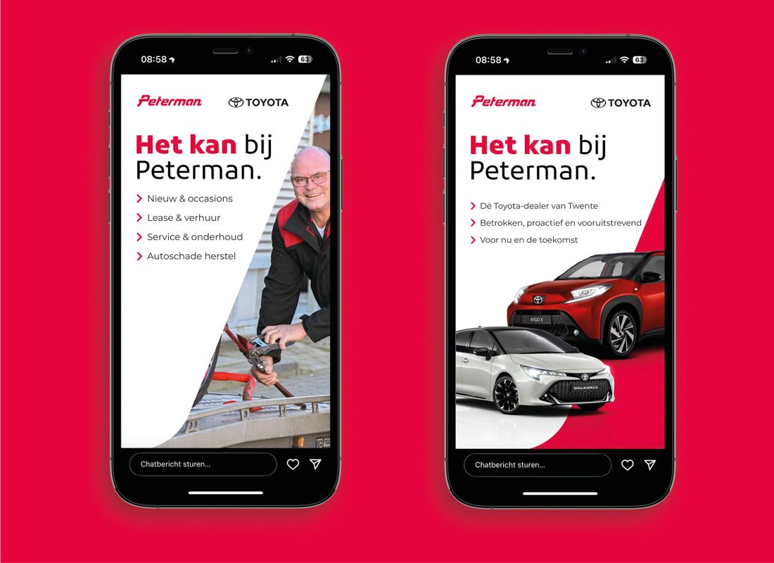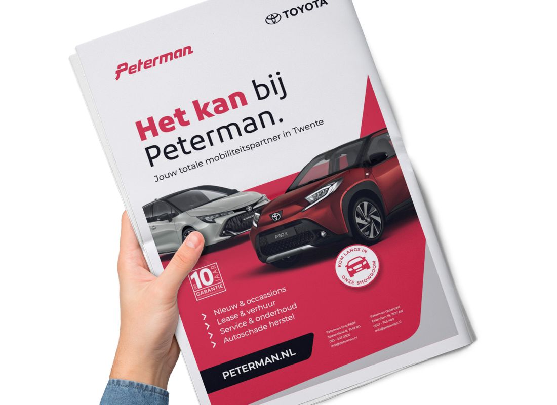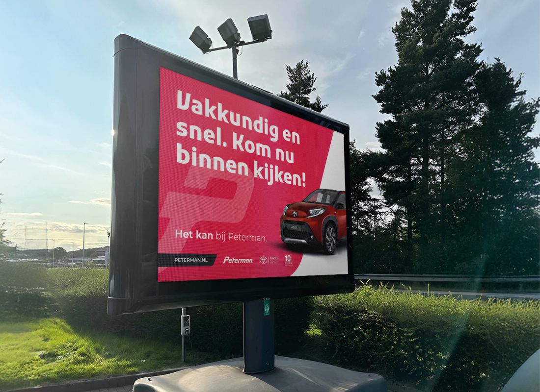 Hoe zorg je ervoor dat een lokaal autobedrijf sterker verbonden wordt met het wereldwijde automerk Toyota? Juist. Met een opvallende campagne natuurlijk! Peterman vroeg ons om de merkassociatie tussen Peterman en Toyota verder te versterken. Het doel? Bestaande klanten laten ervaren dat Peterman en Toyota onlosmakelijk met elkaar verbonden zijn en potentiële nieuwe klanten overtuigen van de uitgebreide mogelijkheden die Peterman biedt. Met een veelzijdige campagne, zichtbaar door heel Twente, hebben we gezorgd voor een ijzersterke merkbeleving. En voor Peterman nog belangrijker: klantloyaliteit.